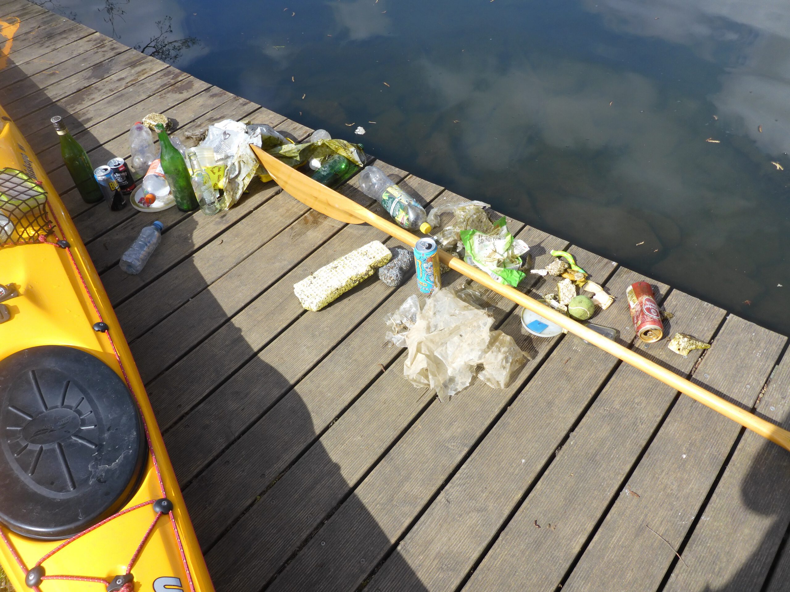 Wir fuhren den See bis zur Stauanlage Engelskirchen, drehten dort um und fuhren wieder die Agger hoch zur Stauanlage Ohl. Bereits auf der ersten Runde bemerkten wir den vielen Plastikmüll am Ufer und in den Büschen. Auf der zweiten Runde begannen wir dann, nebenbei den Müll aus dem Wasser, vom Ufer und aus den Büschen aufzusammeln. Zunächst hielt es sich in Grenzen; hier ein Fetzen Plastik, dort eine Getränkedose. Erst in der Nähe der Stauanlage Engelskirchen, wo das Wasser keine Strömung mehr hat, sammelte sich der Müll unübersehbar an einer Treibgutbarriere.